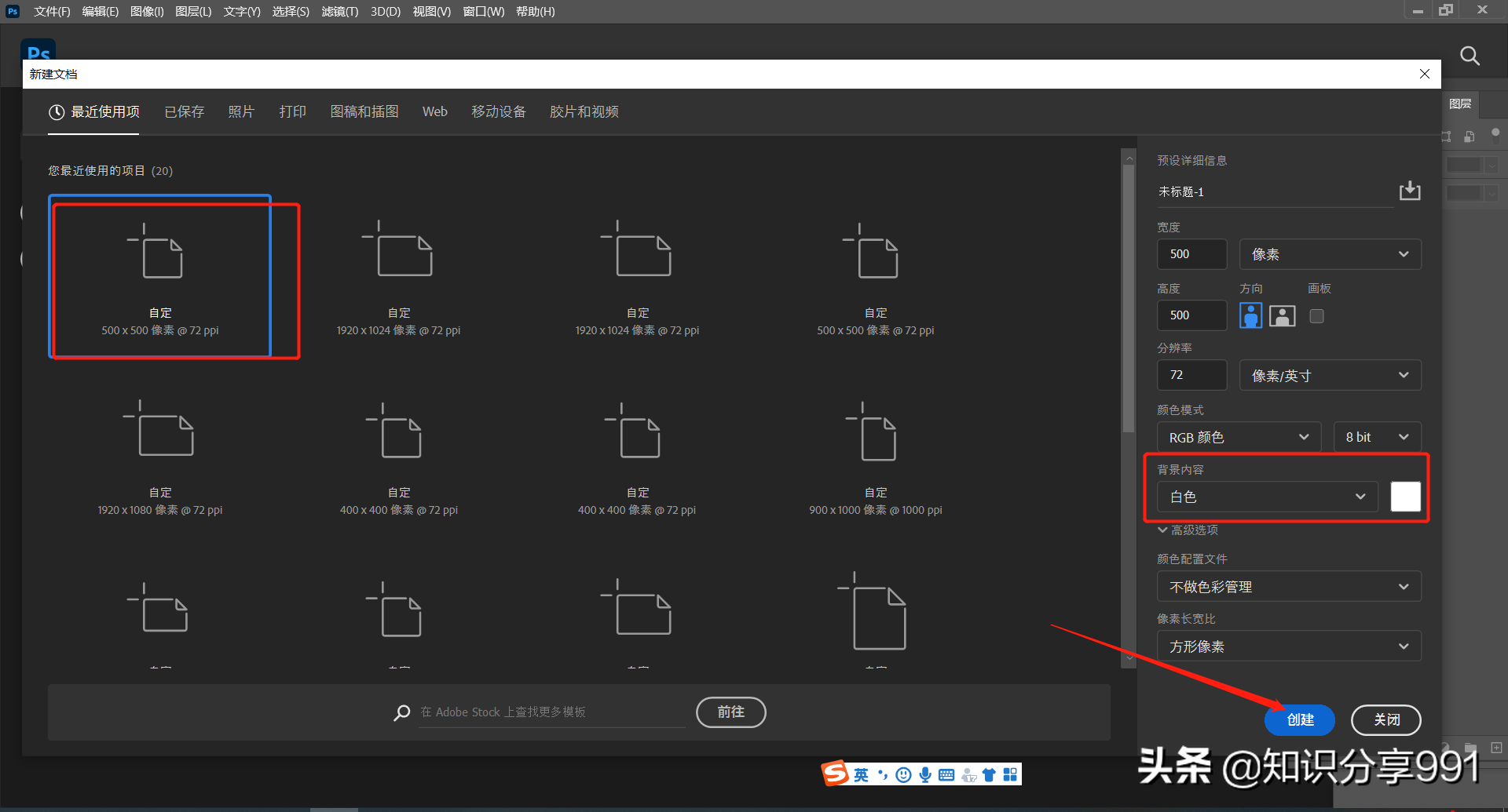 首先,新建500*500像素的白色背景空白图层,选好尺寸后直接点击创建按钮。