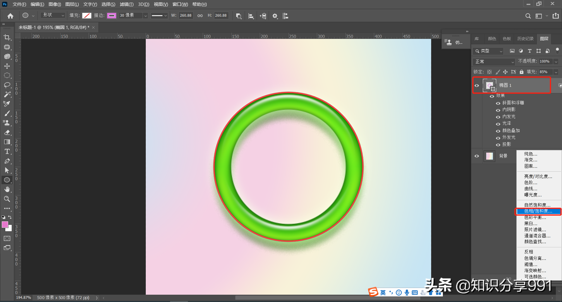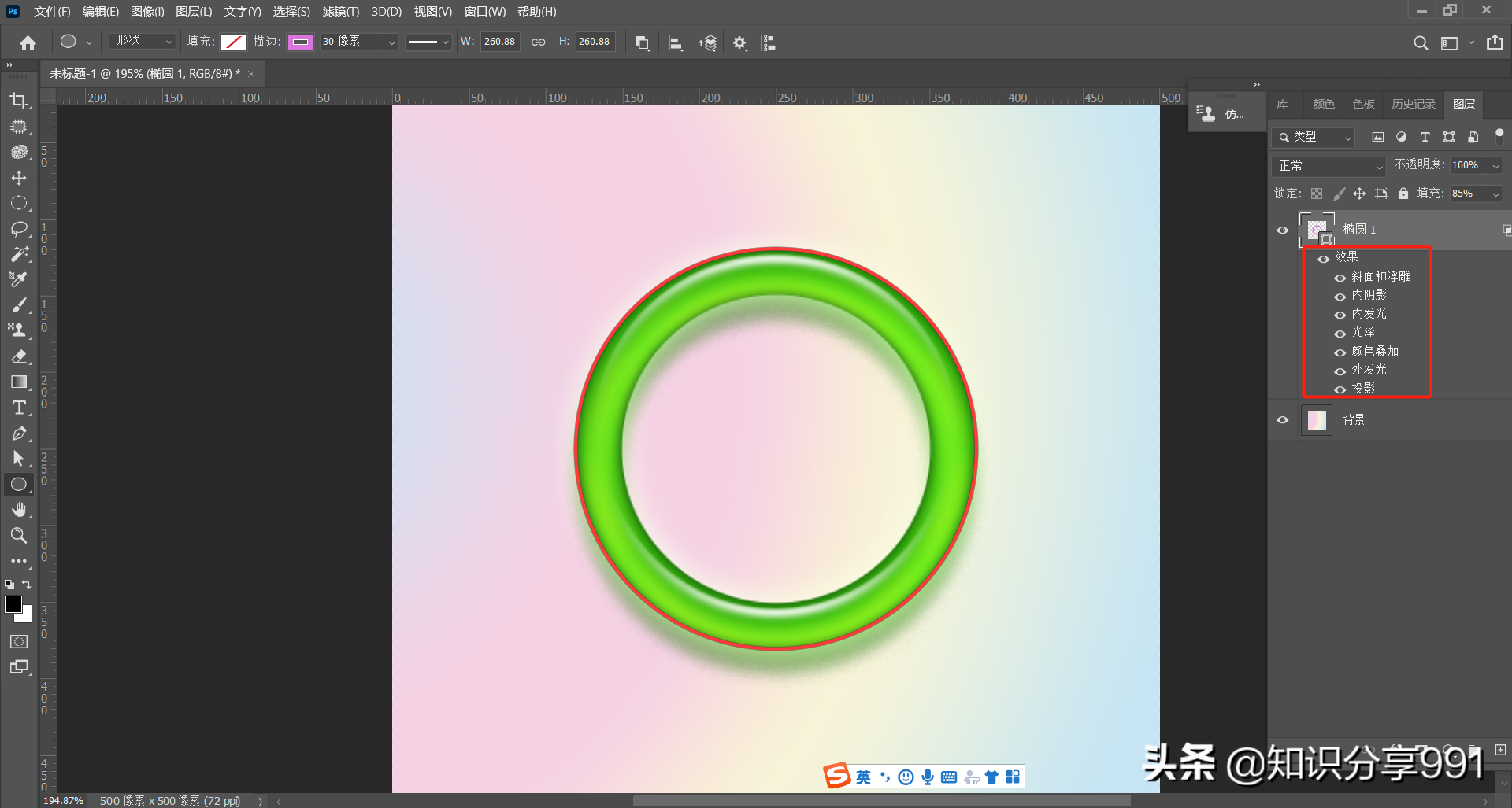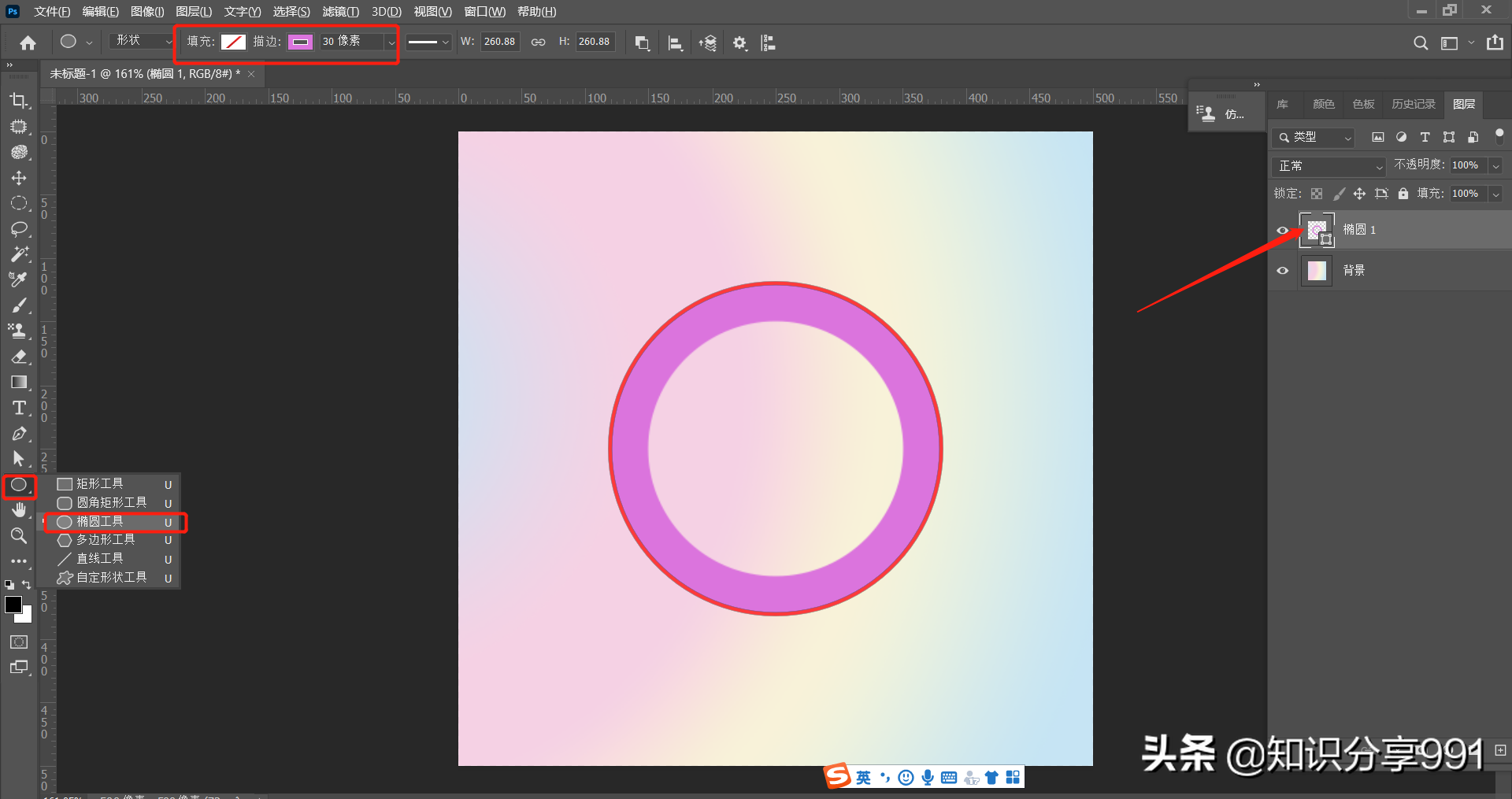 ④设置椭圆工具的属性栏:填充设置无填充,描边选择一个颜色填充,描边宽度设置30 像素