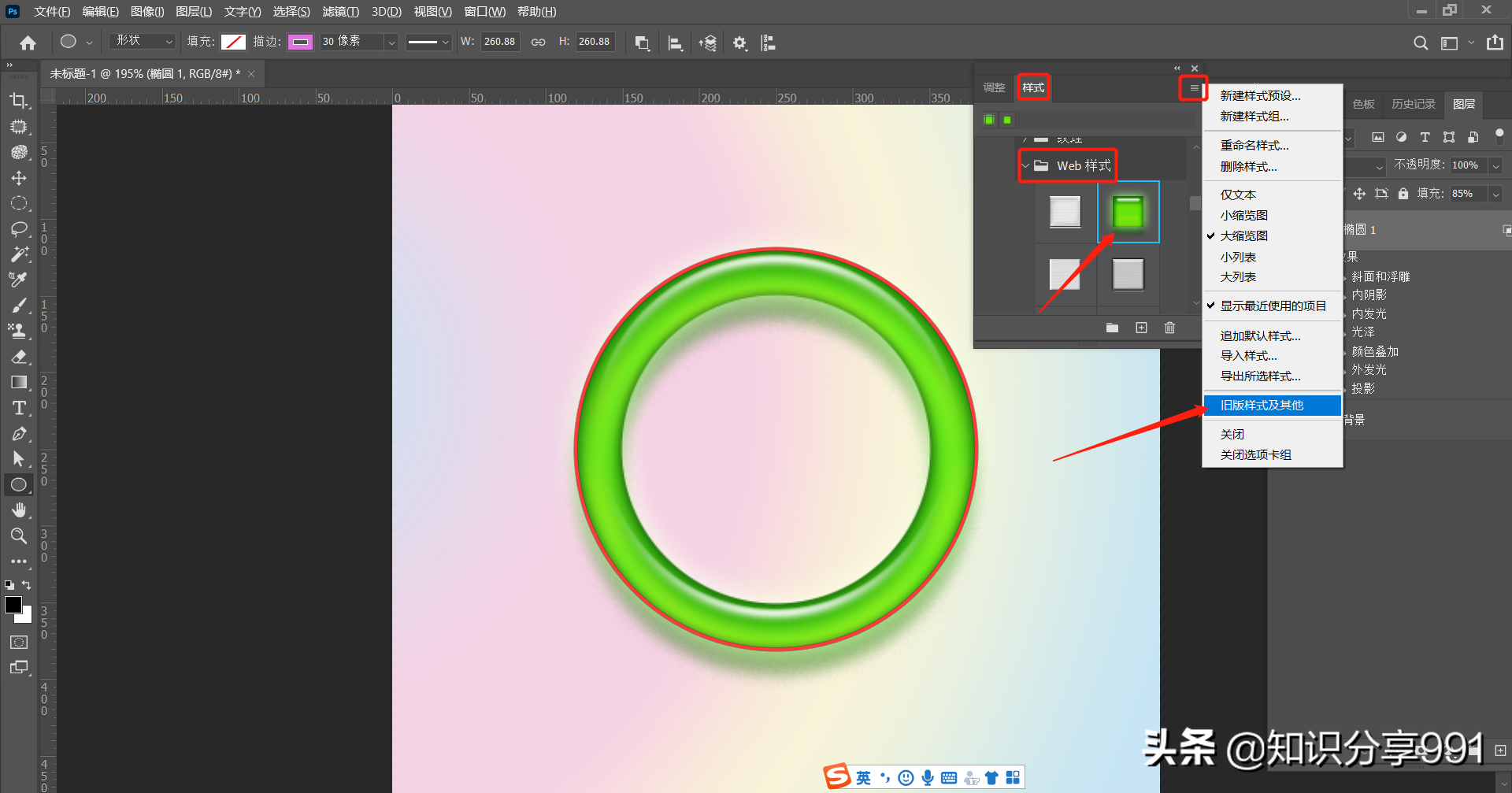 在弹出的设置框中选中样式,点击右侧的四条横线的扩展按钮选择旧版样式及其他设置 在web样式中找到带投影的绿色凝胶样式。