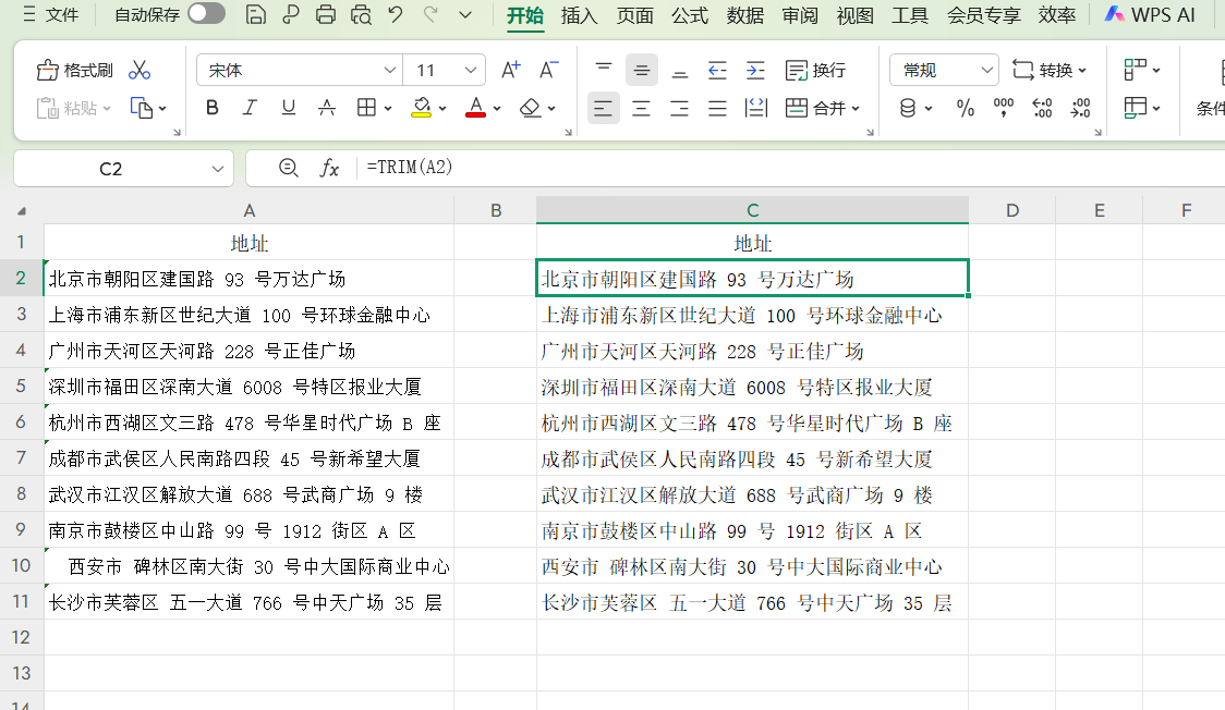整理客户地址时,文本前后的空格会导致列宽不一致,表格显得杂乱。