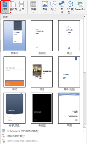 1.单击【插入】选项卡,在“页面”选项组中选择“封面”。