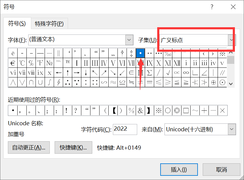 ✿ 在【子集】中选择【广义标点】即可找到小圆点。