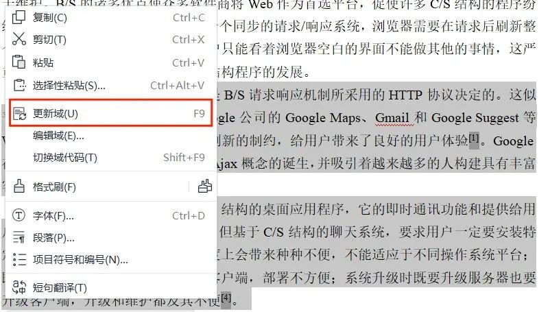 ✿全选需要更换文献序号的文章段落,右键并点击更新域