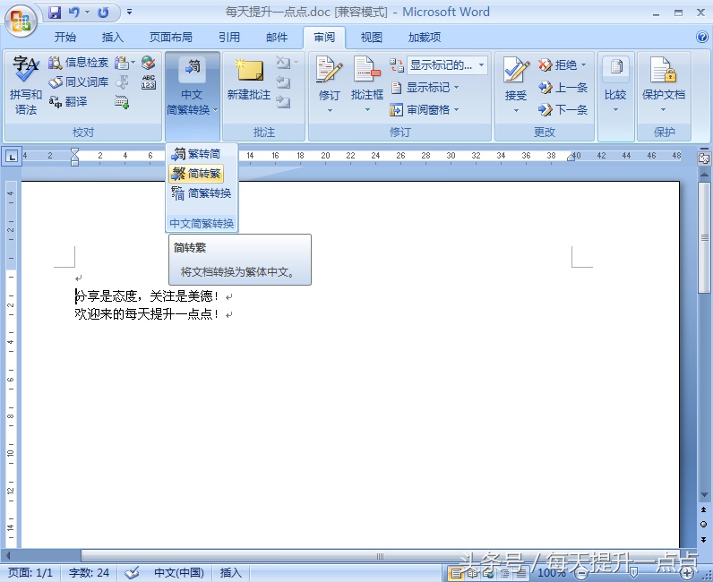 2、在“审阅”选项卡里,选择“中文简繁转换”,然后点击“简转繁”。