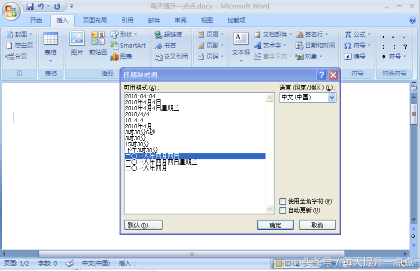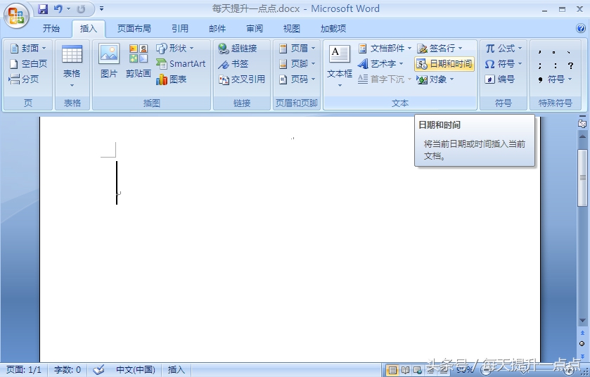 1、在word文档的“插入”标签,点击“日期和时间”。