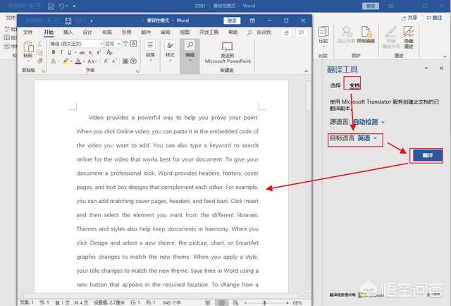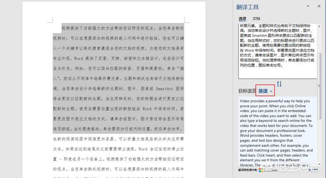2、在文档右边弹出一个“翻译工具”的窗口 — “目标语言”选择“英语”即可,选中的段落就会自动被翻译。