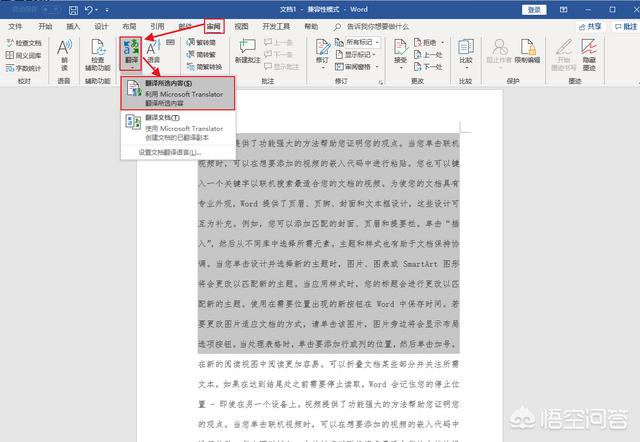 1、打开一篇要翻译的Word 2016文档 — 选中你要翻译的段落 — 点击菜单栏的“审阅”选项卡 — 点击“翻译”– 选择“翻译所选内容”。