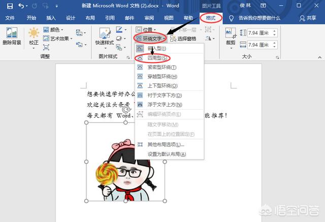 4、选中插入的图片 — 点击菜单栏的“格式”选项卡 — 在“环绕文字”的下拉菜单中选择“四周型”。