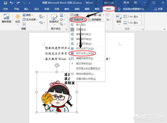 具体操作步骤:只需要将方法一第4步中的“环绕文字”下拉菜单中选择“浮于文字上方”即可。