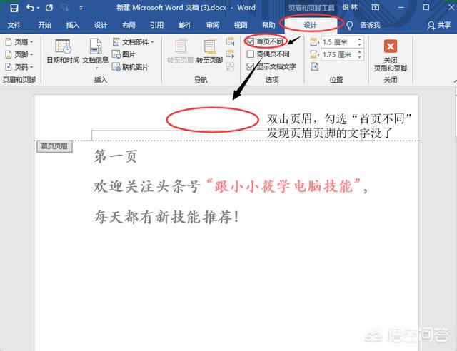1、双击页眉处进入“页眉页脚”编辑状态 — 点击菜单栏的“设计”选项卡 — 在“选项”工具栏的“首页不同”前面复选框打钩。