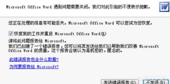 word在使用过程中经常会遇到“发送错误报告”的提示框,在这个对话框中有”发送错误报告”和“不发送”两个按钮。选择“不发送”则word将关闭。