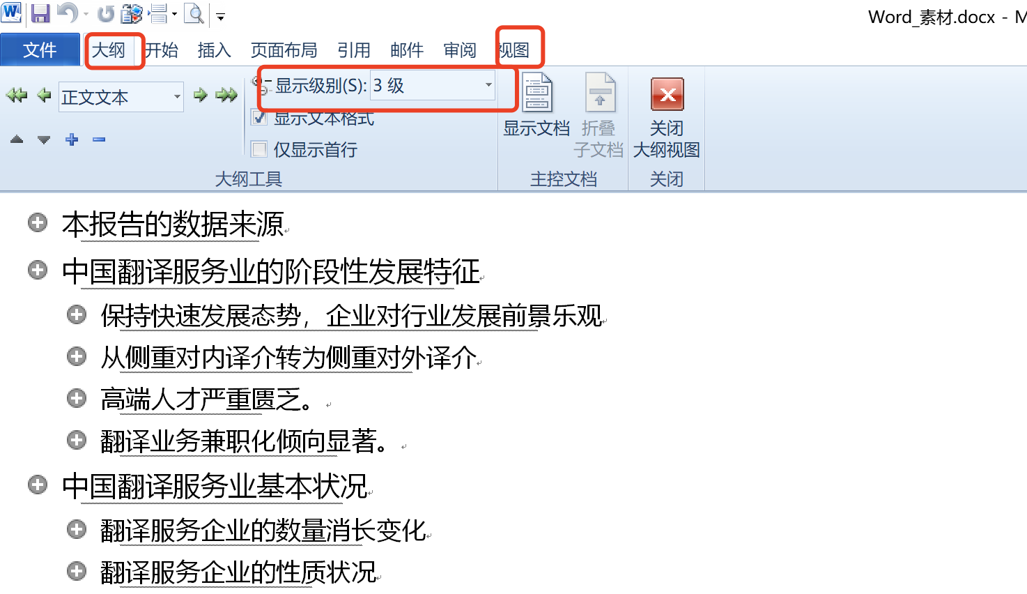 首先我们先定位到视图->大纲视图下,同时在显示级别中显示3级(这里可以根据自己的情况来设置)例如: