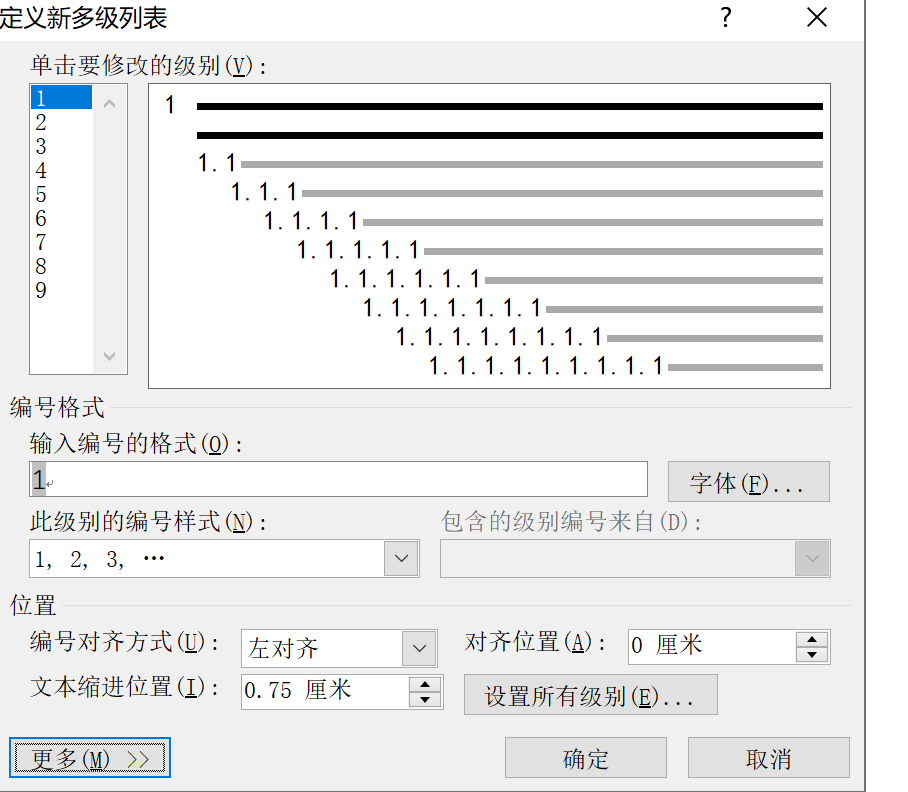 选择修改级别1,并在编号样式选择一、二、三这种形式,同时将级别链接到标题1上,如下图所示: