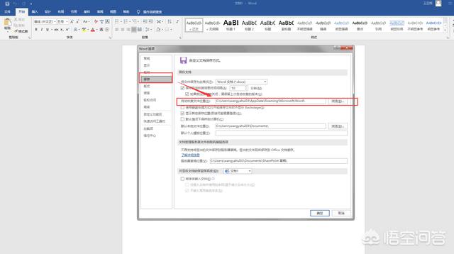 1、首先我们需要点击文件然后点击选项,然后选择保存,找到自动恢复文件位置,复制这个路径,如下图所示。