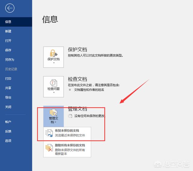 2、然后我们点击文件然后找到信息,在信息中找到管理文档,选择恢复未保存的文档,