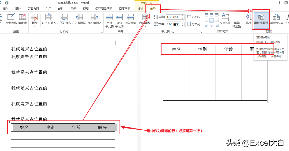 然后,点击【布局】标签下的“重复标题行”按钮。