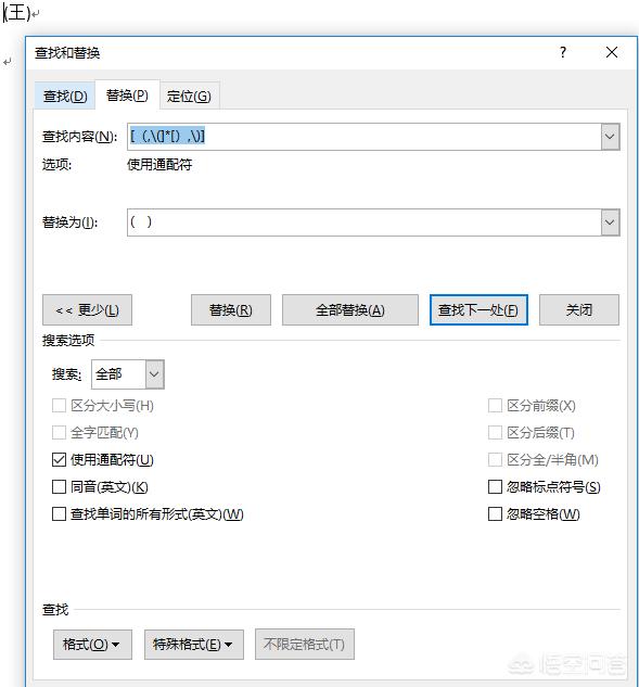 为什么要这么麻烦呢?这是因为括号有全角、半角之分,或者说是中文括号和英文括号之分。中文括号可以直接查找替换,但是英文括号在Word的查找替换代码中有特殊含义——表示表达式。所以,如果要查找英文括号,必须用【\】来转义。