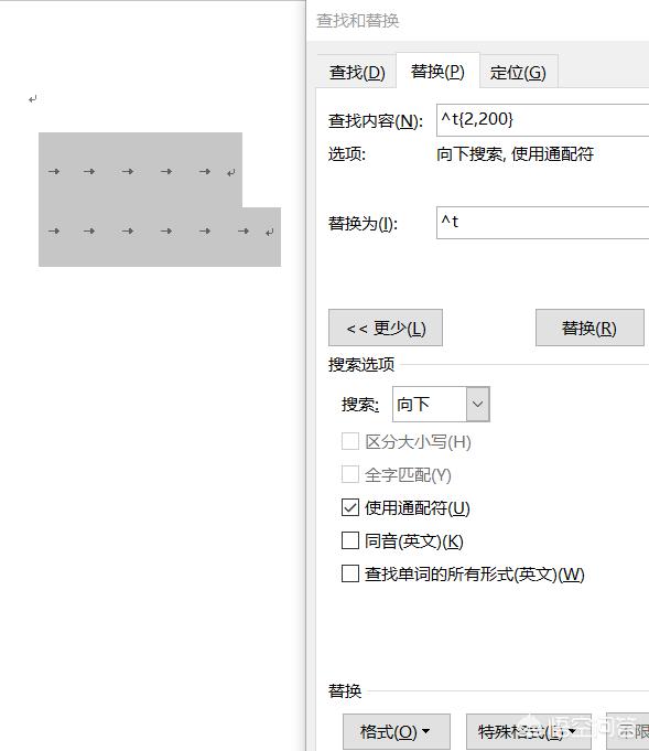 查找内容里的【^t】是制表符,【{2,200}】是指前一个字符出现的次数,示例中前一个字符是制表符,要查找它出现的次数是在2-200之间。这里的数字区间根据您想保留的制表符以及实际出现的制表符个数而定。