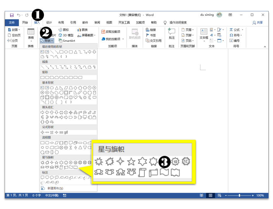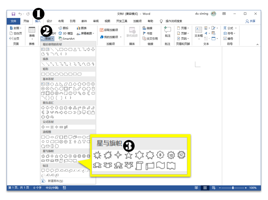 再次选择【插入】选项卡,单击【插图】命令组中的【形状】下拉按钮,从弹出的列表中选择【星形:五角】选项。