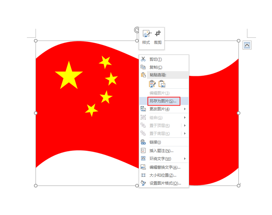 右击文档中的图片,从弹出的菜单中选择【另存为图片】命令,即可将制作的五星红旗图片保存在当前电脑硬盘中。