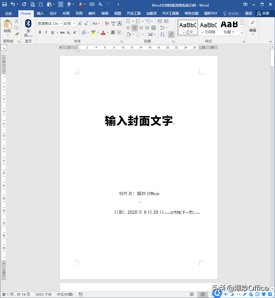 与插入目录页相同,也是使用分节符的方式插入新的封面页,然后设计封面版式。