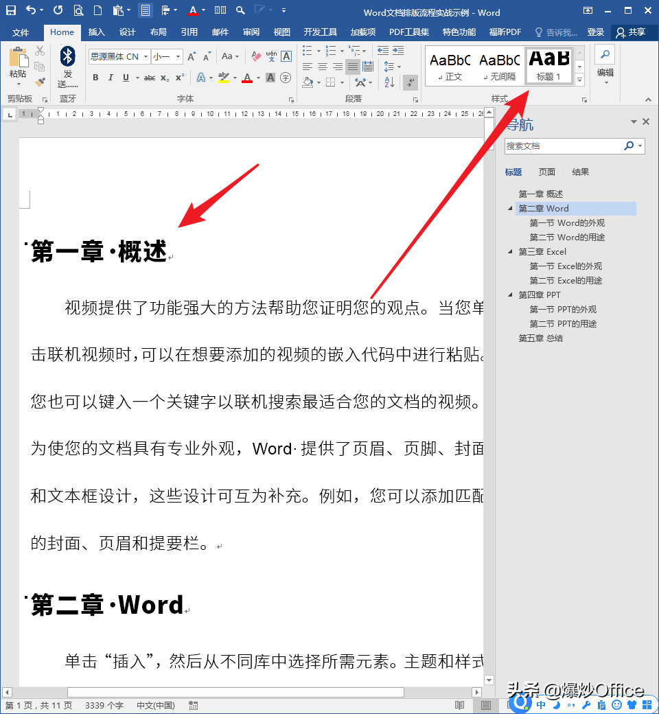 通过上述几步,文档正文框架基本就定型了。接着设置各个级别标题的样式。可以开启【导航窗格】,直观查看文档中各个级别标题的存在。