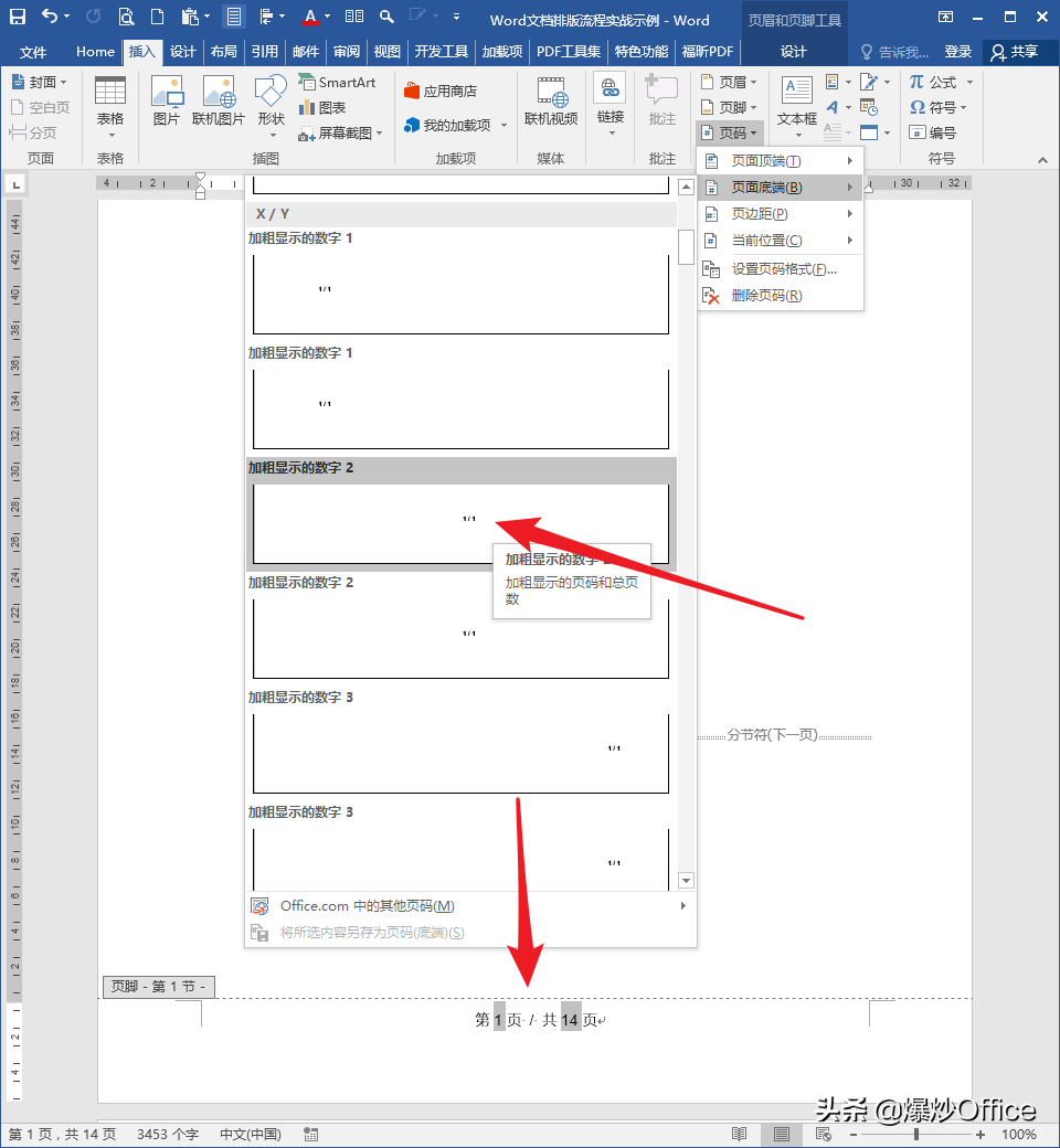 先直接全文插入统一样式的页码,为了严谨,建议使用【第几页 / 共几页】这种页面样式,这样可以确保在打印后不会缺页。