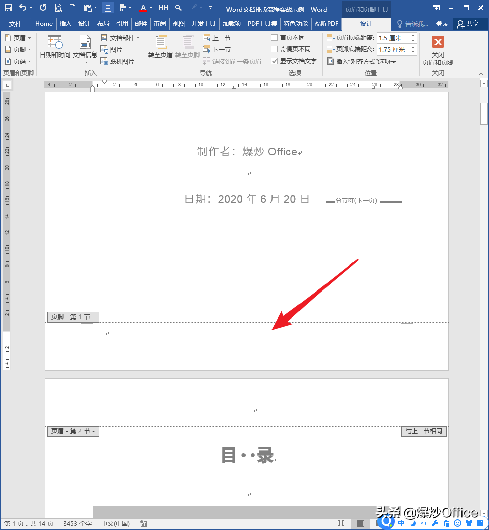 从这里,就能回答之前的所有问题了。因为封面、目录都是使用分节符的方式插入的页,所以封面、目录、正文都是相对独立的节,可以设置不同的页脚和页眉。