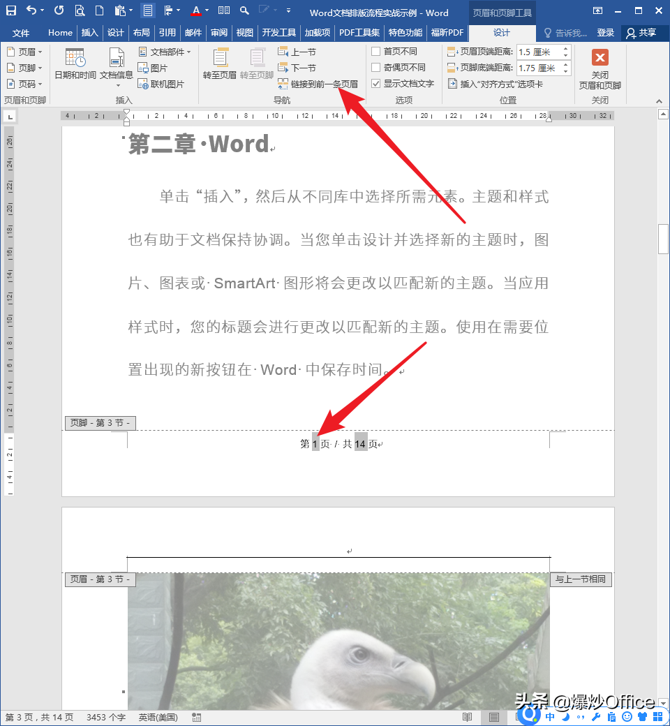回到正文部分的页码,取消掉【链接到前一条页眉】,并把页码序号设置为从1开始。