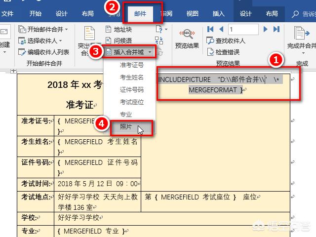 如图,将光标定位到“准考证号”方框中,点击“插入合并域”——“准考证号”,然后依次插入其他合并域(除了照片)。注意,这里的域和Excel表格中的标题是一一对应的。