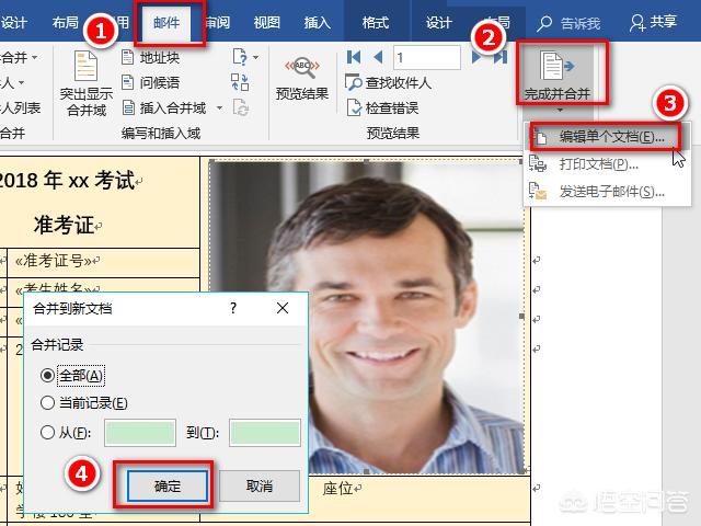 现在点击“邮件”——“完成并合并”——“编辑单个文档”,选择合并全部。这时word会自动生成一个新的文档,文档中的照片都是第一个人的照片,除此之外,其他信息都一一填入各自的准考证中啦。