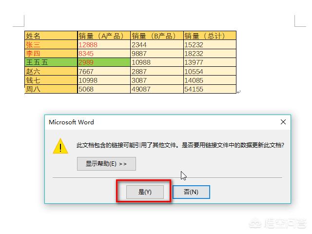 如果直接在Excel中修改数据,再次打开时就会看到word提示文档有更新,点击“是”即可完成更新。