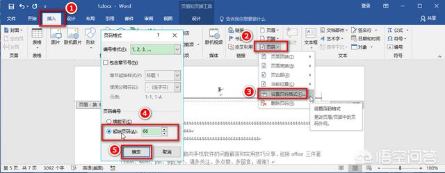 2. 插入页码,接着点击“设置页码格式”,输入“起始页码”(例如66),然后关闭页眉和页脚编辑,就会看到66啦。