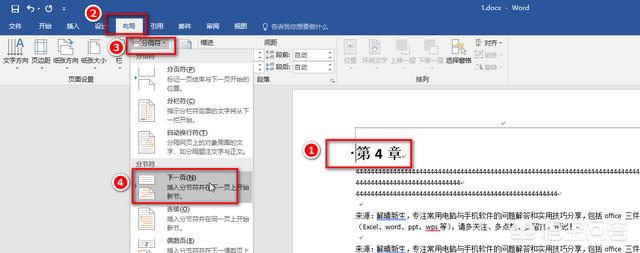 1. 将光标定位到需要设置页码的界面,点击“布局”——“分隔符”——“下一页”,这时会在光标前多出一个空白页。