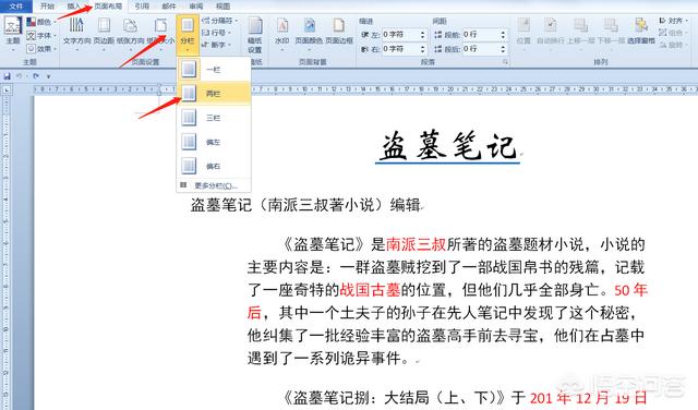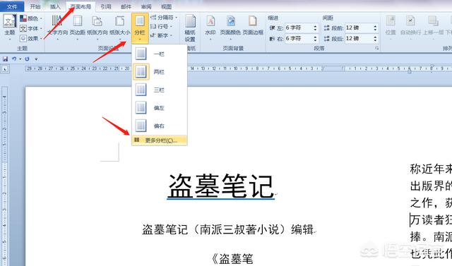 首先,我们在页面布局菜单中找到分栏并选择需要的样式,如下图所示: