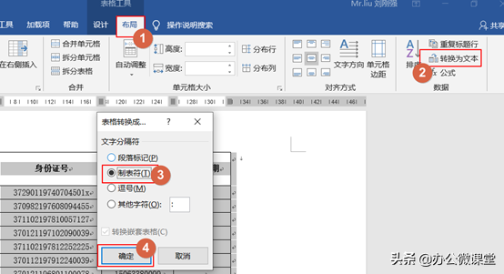 步骤一:选中表格,打开【表格工具】下的【布局】选项卡,找到【转换为文本】按钮,选择“制表符”,点击【确定】(这一步的目的是将表格转换成文本,方便我们后期选择文字)