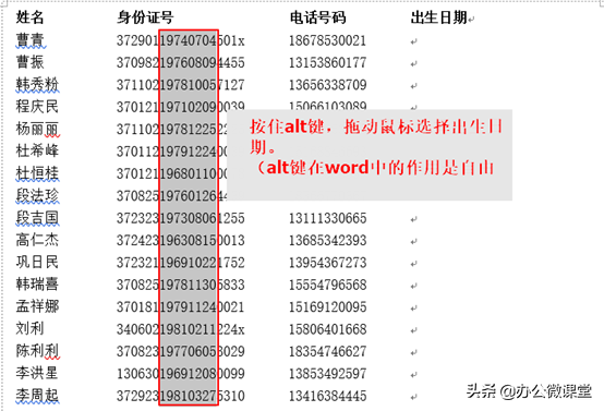步骤二:按住键盘Alt键,拖动鼠标左键进行选择中间出生日期8位数字。(注意:一定要先按住Alt键再拖动鼠标,Alt键在word中的作用是自由选择。)