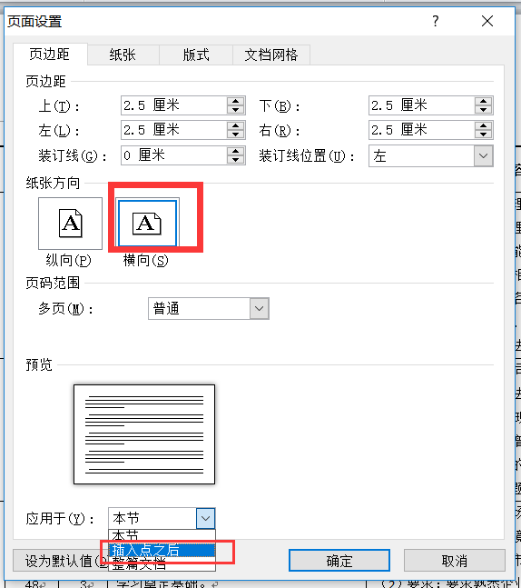 在弹出的对话框中选择“横向”,应用于“插入点之后”。