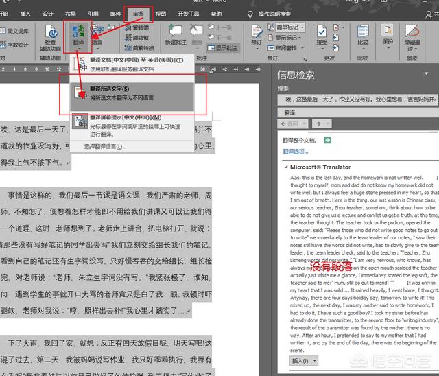 我们将工具栏切换到审阅,然后点击翻译,在弹出的下拉菜单里选择翻译文档。