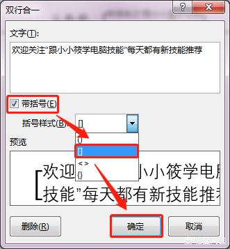弹出“双行合一”对话框 — 勾选“带括号”– 选择想要的“括号样式”– 点击“确定”按钮即可。