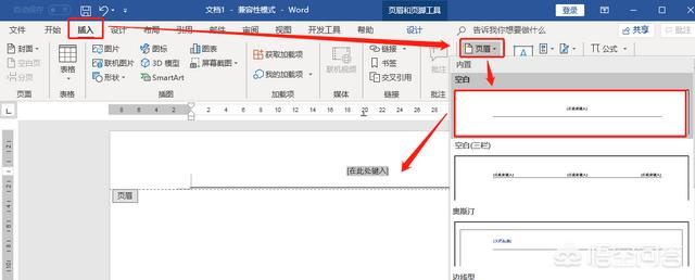 (或者点击菜单栏的“插入”选项卡 –“页眉”– 选择想要的页眉格式即可)。