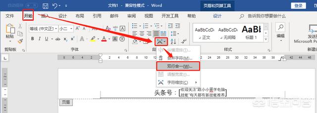 操作:在页眉中输入文字 — 选中要制作成两行的文本 — 点击“开始”选项卡 — 在“段落”处点击“中文版式”–“双行合一”。