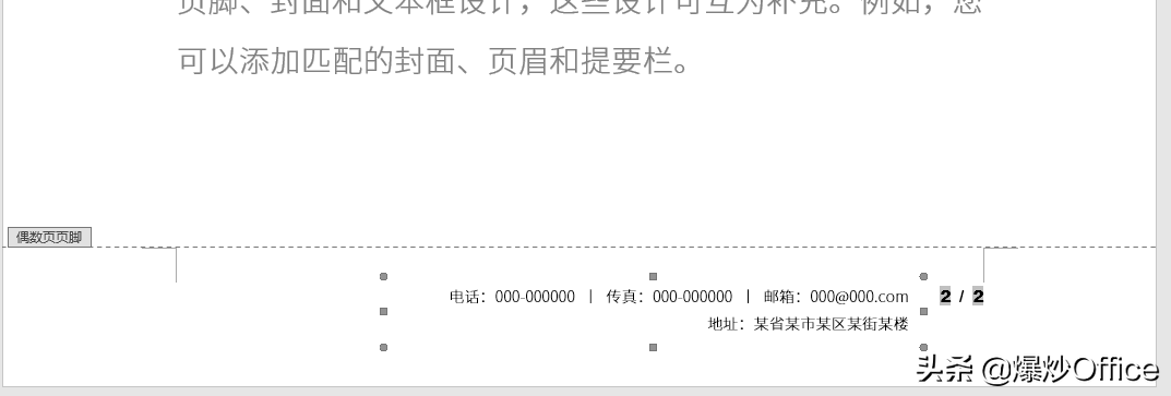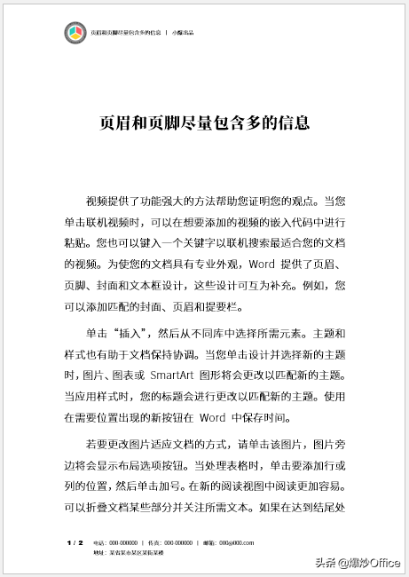 在页码旁边,以页眉中相同大小字号的文本框输入更多的信息,比如常用的电话、邮箱、地址等。