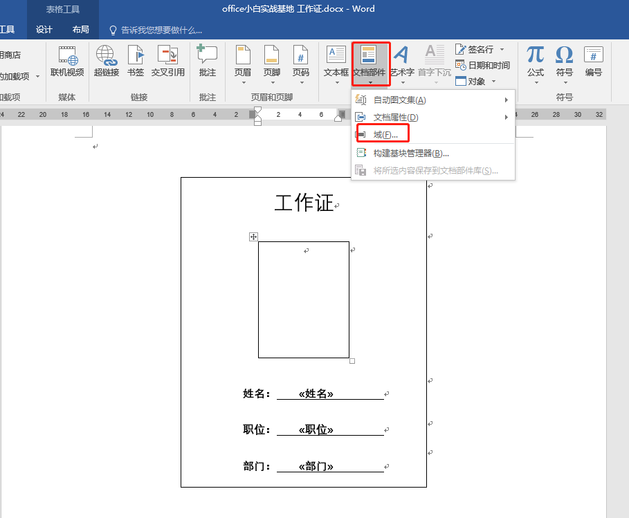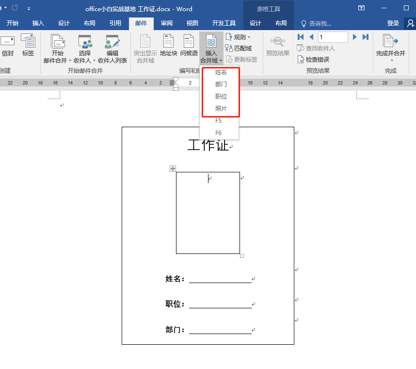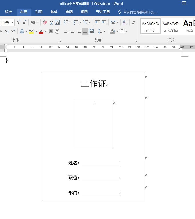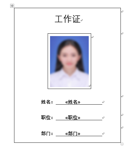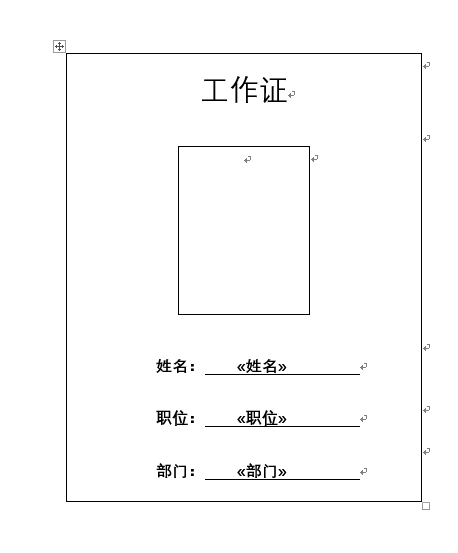 然后,用word我们来简单设计一下工作证的模板,也可以通过公司的设计师来设计好底稿,直接插入即可。这里我们为了做邮件合并的演示,用word来简单画一个吧,如下图: