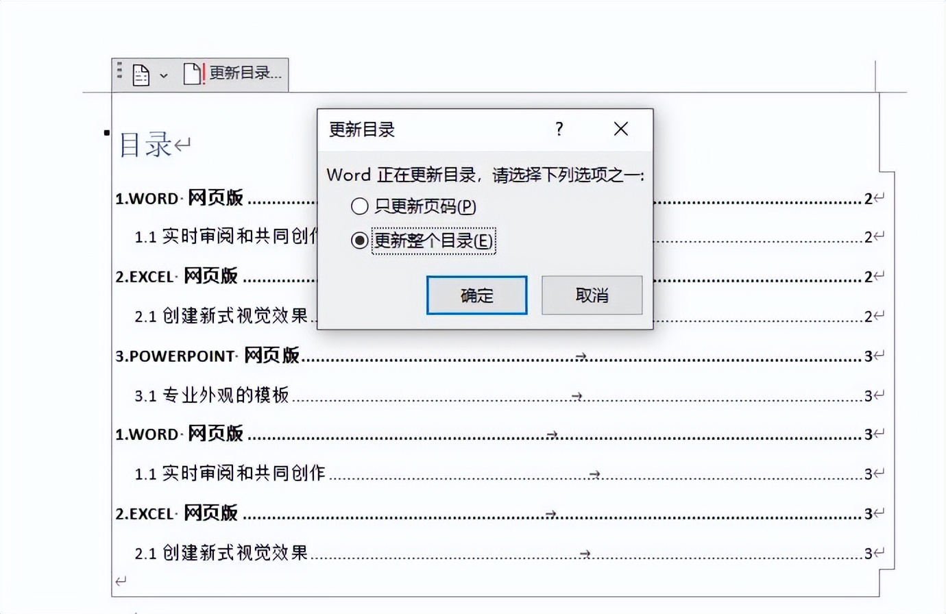完成了标题的层级化后,就可以返回目录,单击“更新目录”,选择“更新整个目录”,将目录补充完整。