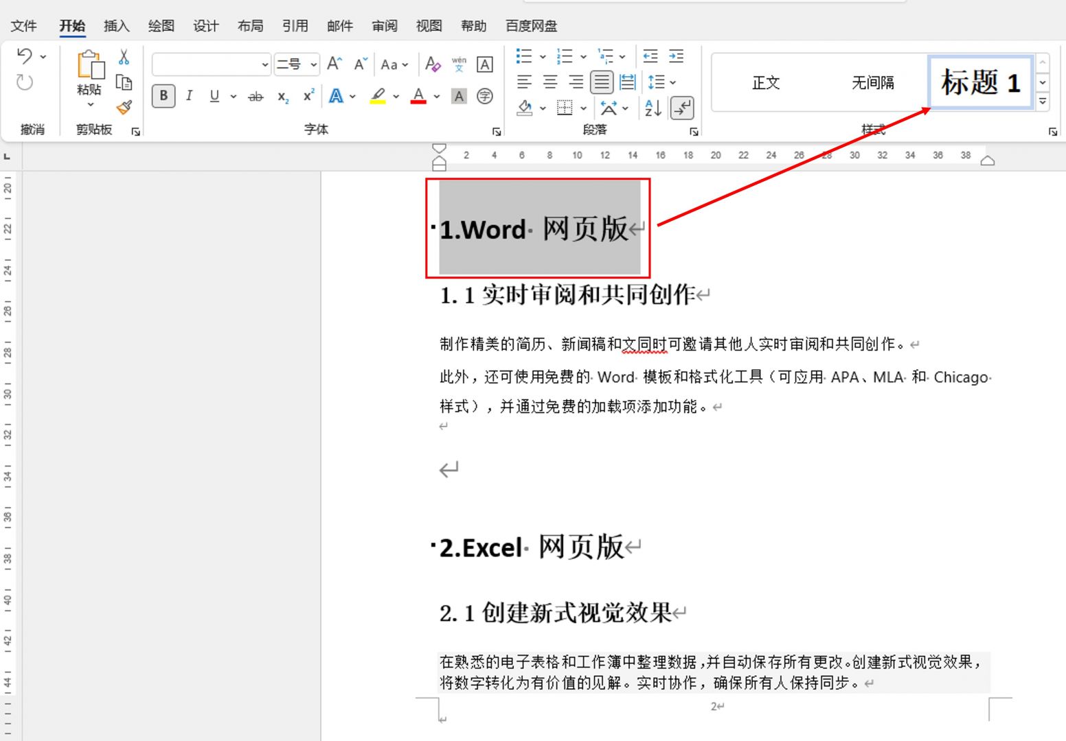 在这种情况下,如图1所示,我们可使用Microsoft 365 word的样式(开始菜单中)功能进行标题的级别设置,将所有一级标题设为标题1,、二级标题设为标题2,依次类推。
