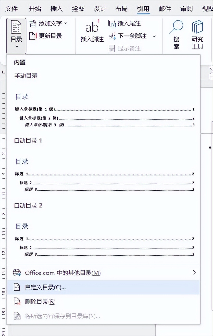 如图4所示,word自动目录默认包含以下样式,如对目录格式无特殊要求,直接使用即可;如发现格式不符合需求,可使用“自定义目录”功能,进行格式的定制。