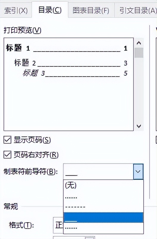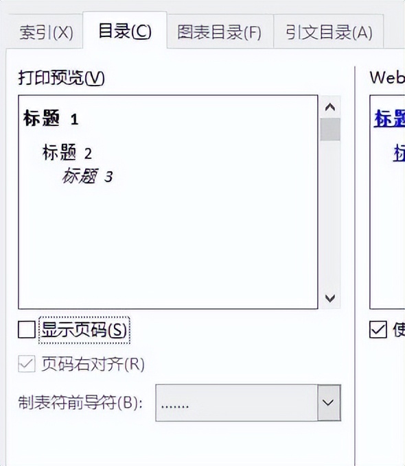 如模板未能满足需求,也可通过页码与前导符的设置定制目录格式。比如,如图6所示,不显示页码的情况下,目录仅出现标题。