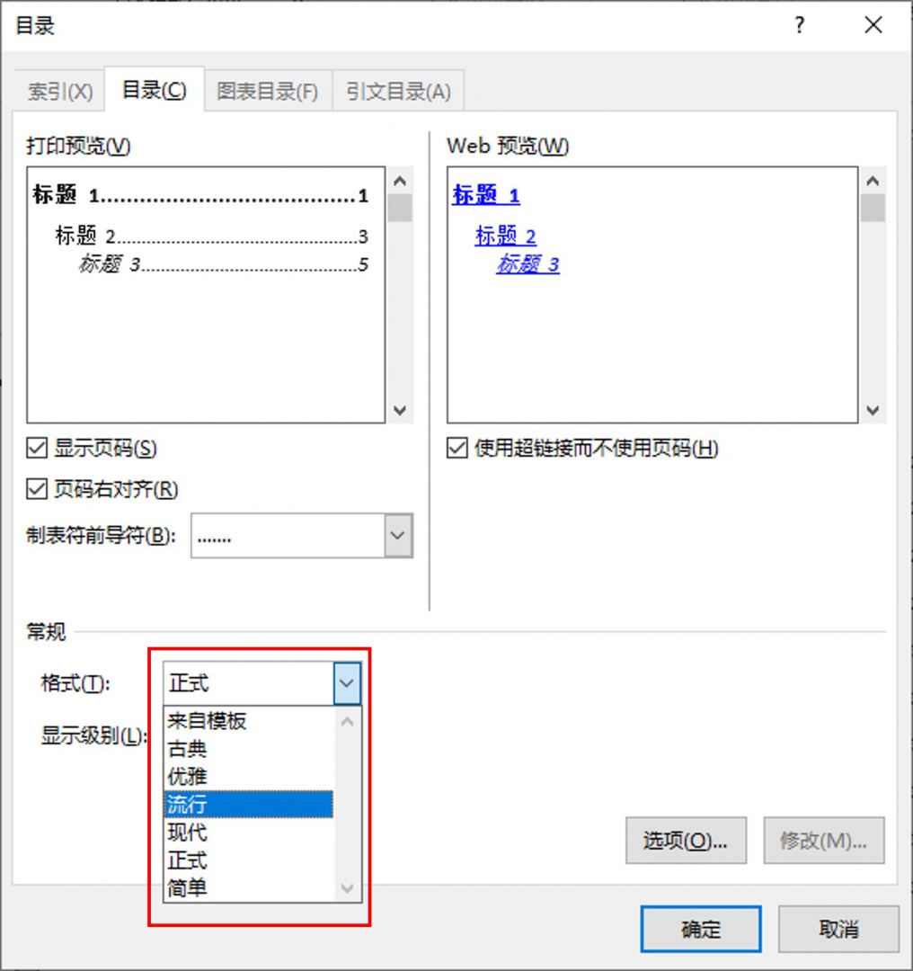 Microsoft 365 word内置了多种目录格式,如图5所示,可通过常规格式设置,选择合适的模板,如古典、优雅、流行等。