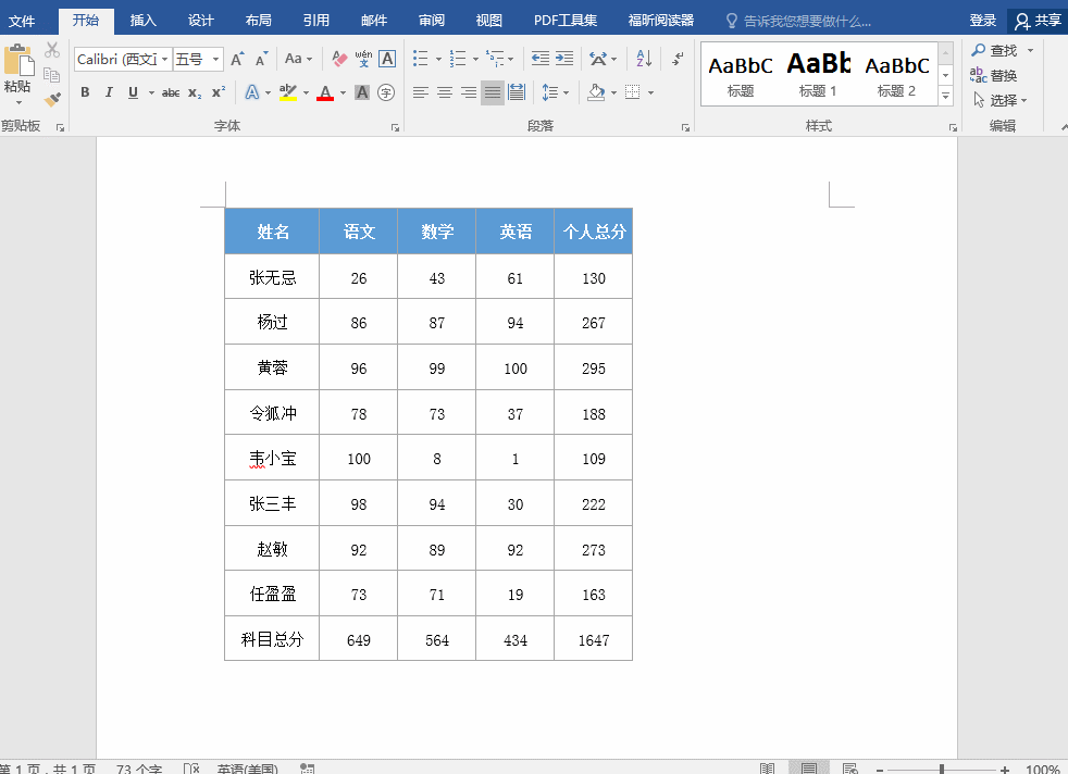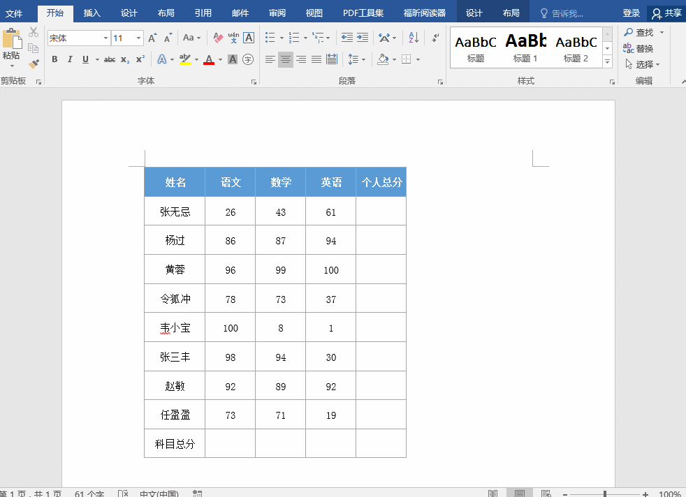 可以看到,我们在Word里成功地对各个科目的分数进行了求和计算,最终结果如下:
